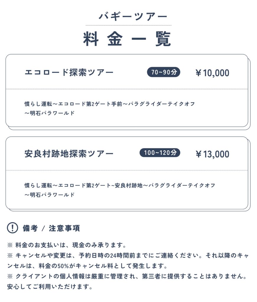 ・ 参加者は、バギー走行が自然環境下で行われ、転倒・衝突等のリスクを伴うことを理解し、自己の責任において参加するものとします。